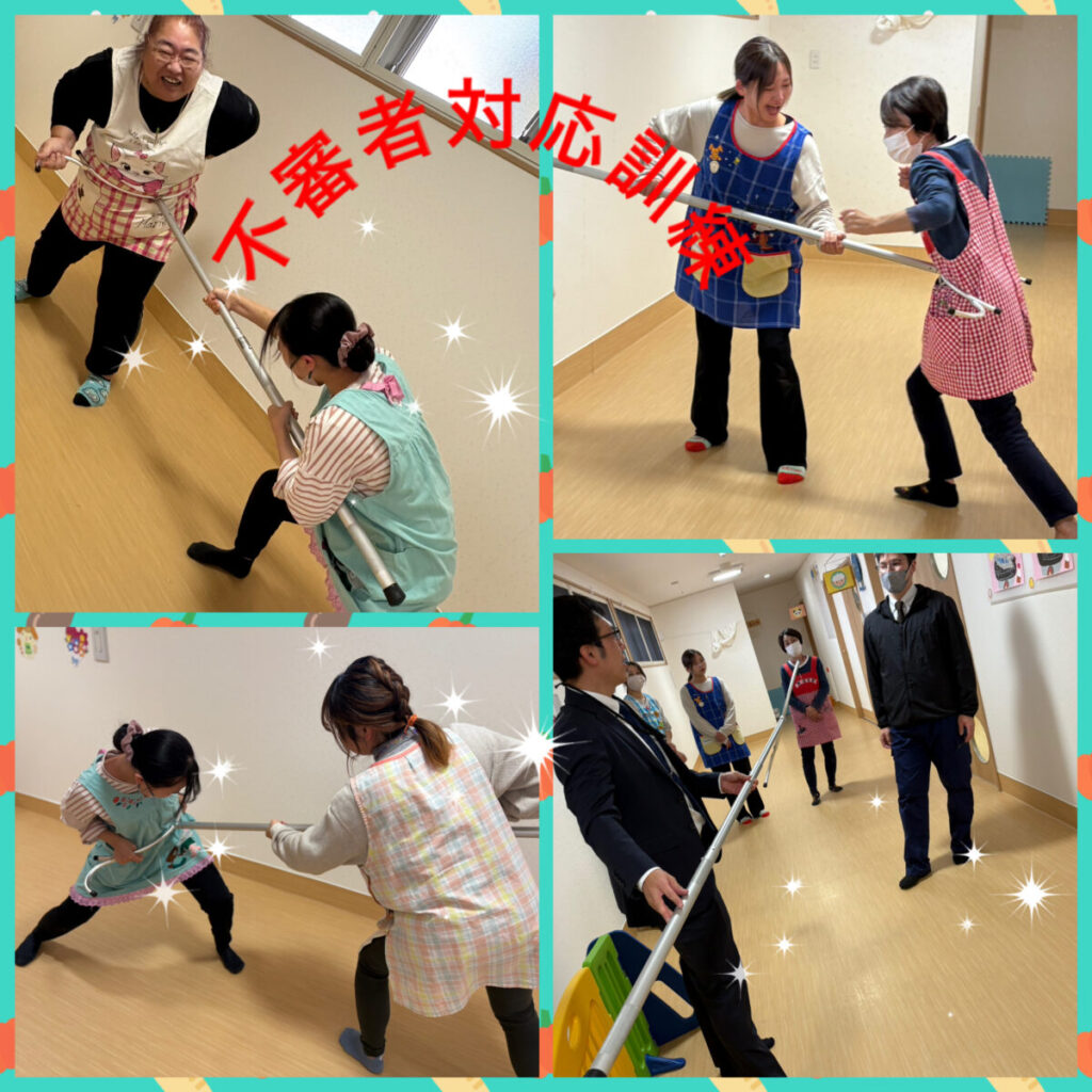 保育者は通報訓練と「さすまた」の使い方の練習を行いました。
