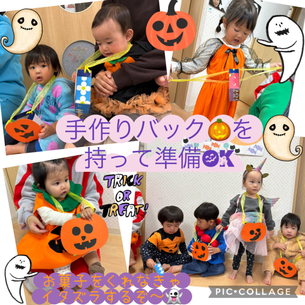 自分たちで作ったカボチャのバッグを持ち、合言葉の「ハッピーハロウィン🎃!」をみんなで良いながらお菓子をもらいにあちこち歩いてお散歩へ👟👻🎃