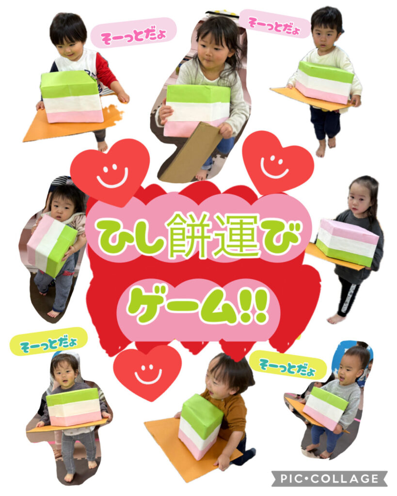 さて、ゲームでは台に乗せたひし餅を落とさないように「そーっとそーっと👐」運ぶ様子がとってもかわいかったです🥰ちゃんと落とさないようにしようと頑張る気持ちが伝わってきました✨顔も真剣です✨