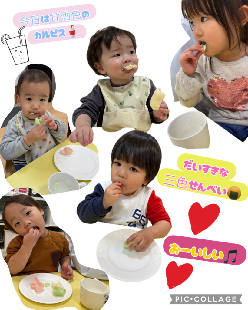 ひし餅と同じ三色のおせんべいと、甘酒色のカルピスを喜んで食べるみんな🥰