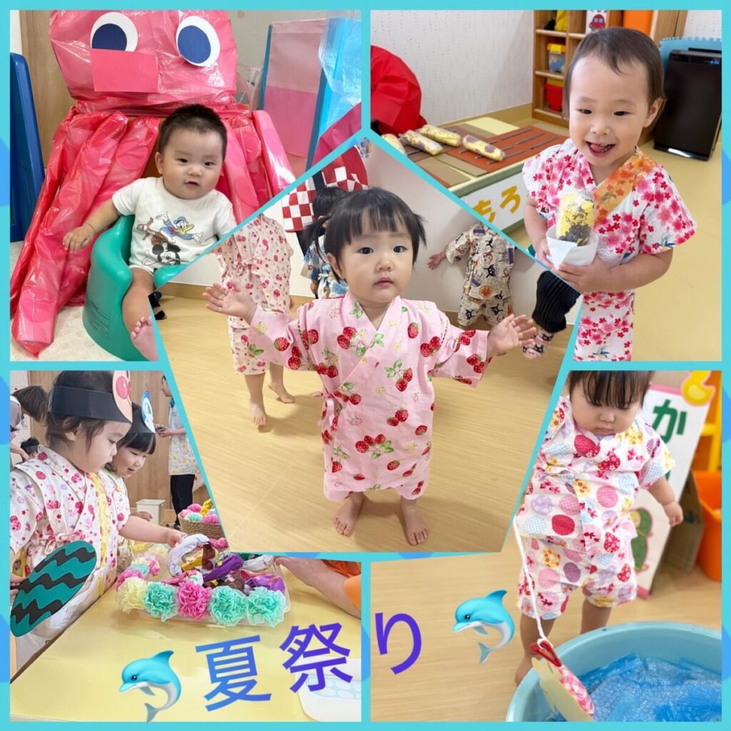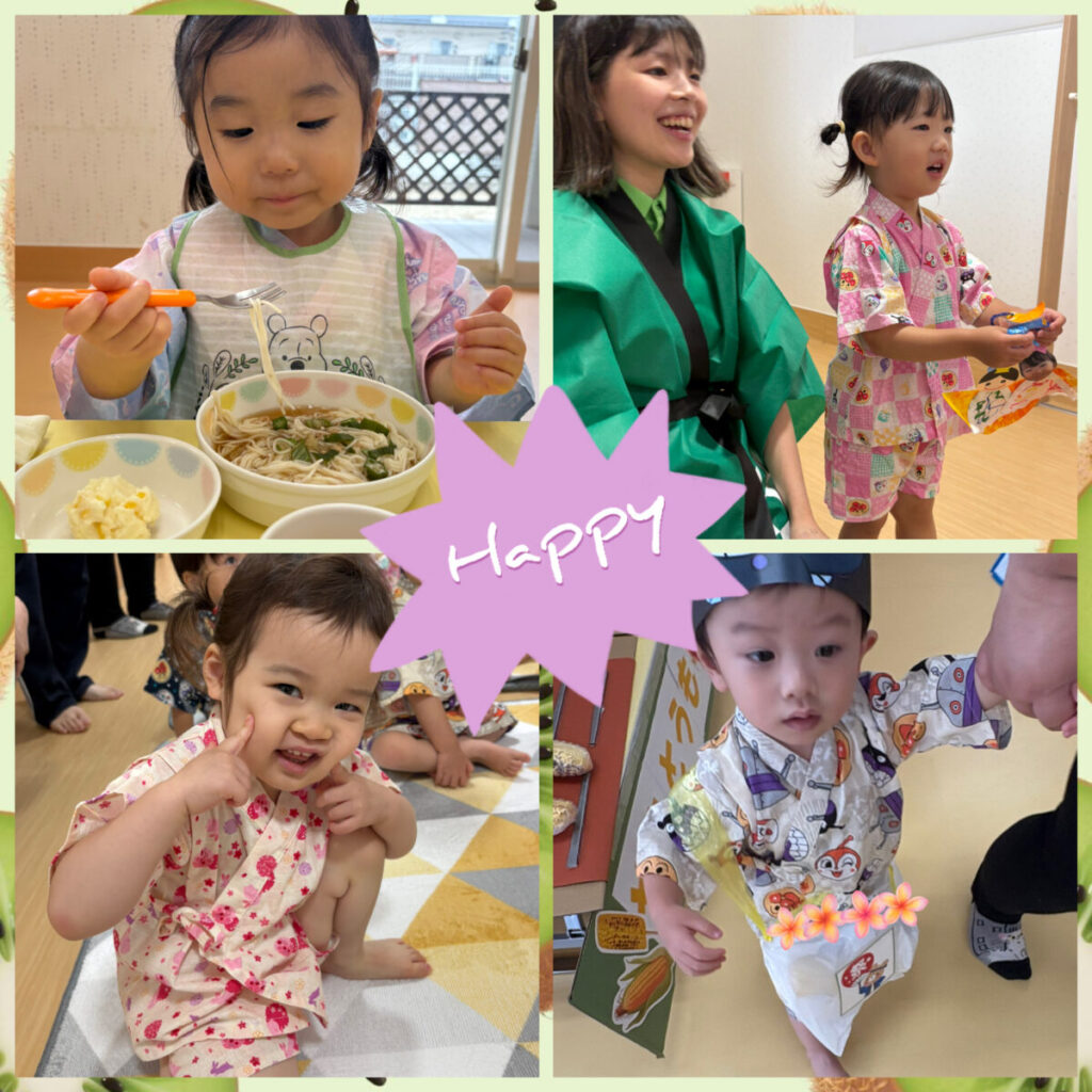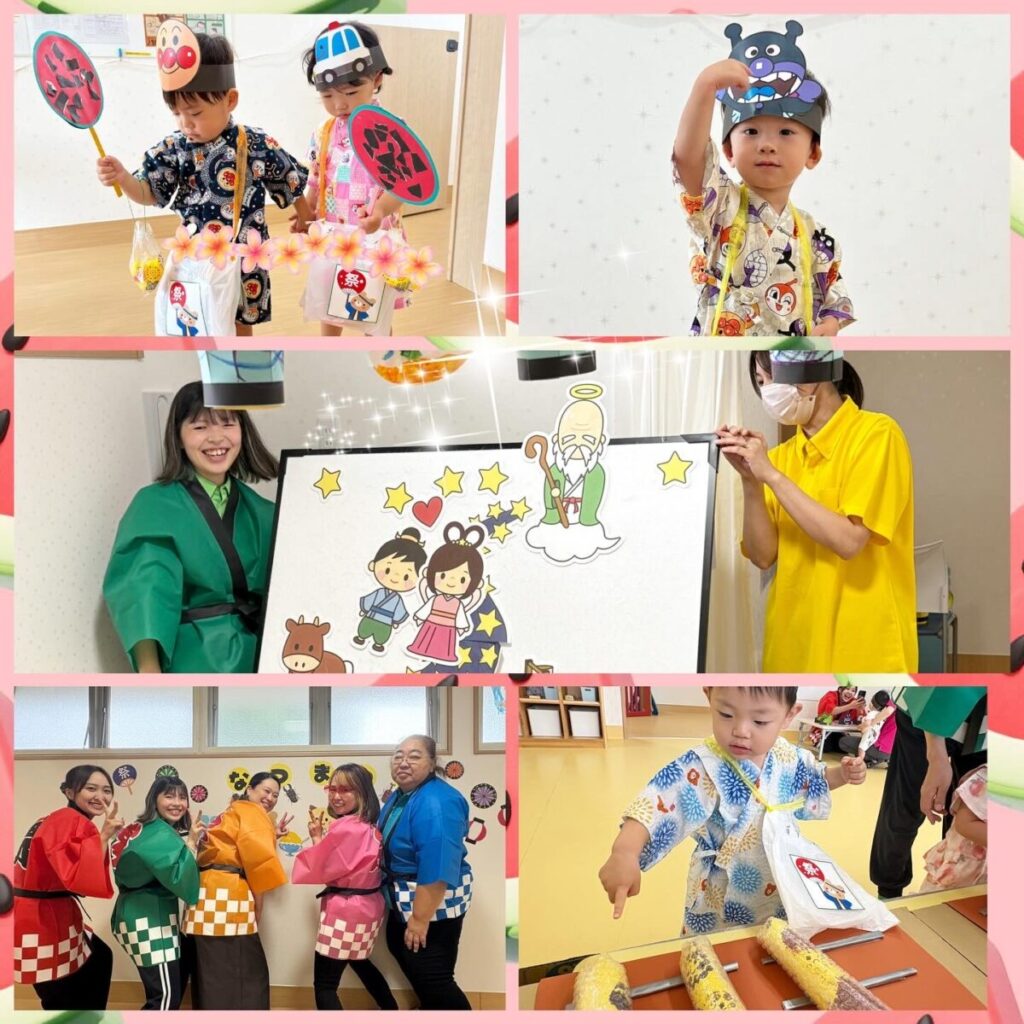 投稿日:2025年9月19日 ~七夕夏祭り会~ 8月1日(金)は七夕夏祭り会を楽しみました! 焼きとうもろこし屋さんに、どーなつ屋🍩おめん屋さんにカメ釣り、ウォーターパラダイスなどなど!たくさんの屋台に子ども達は目を輝かせていましたよ✨可愛い甚平姿で「たぷたぷ音頭」を踊り、決めポーズもバッチリ!七夕のお話にも夢中になっていましたよ🌟笑顔いっぱいの時間を過ごすことができました😊