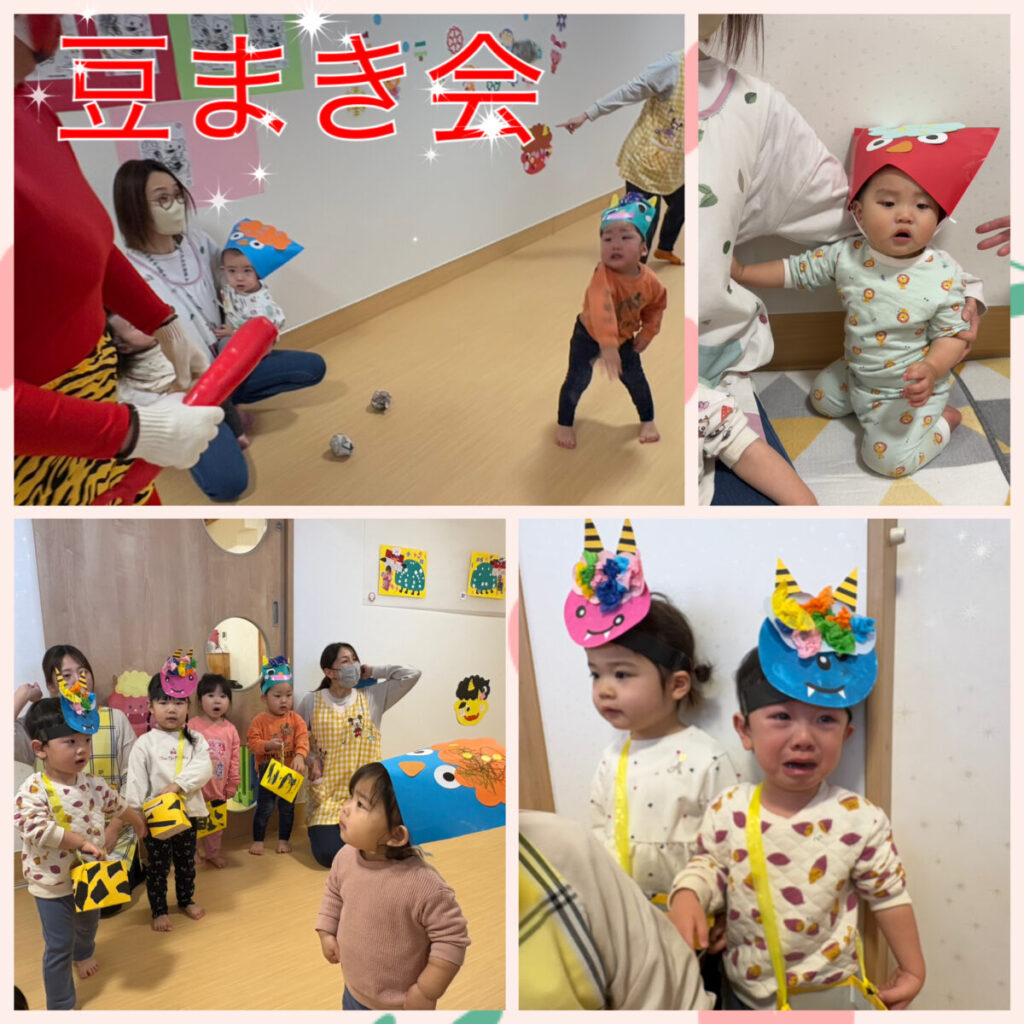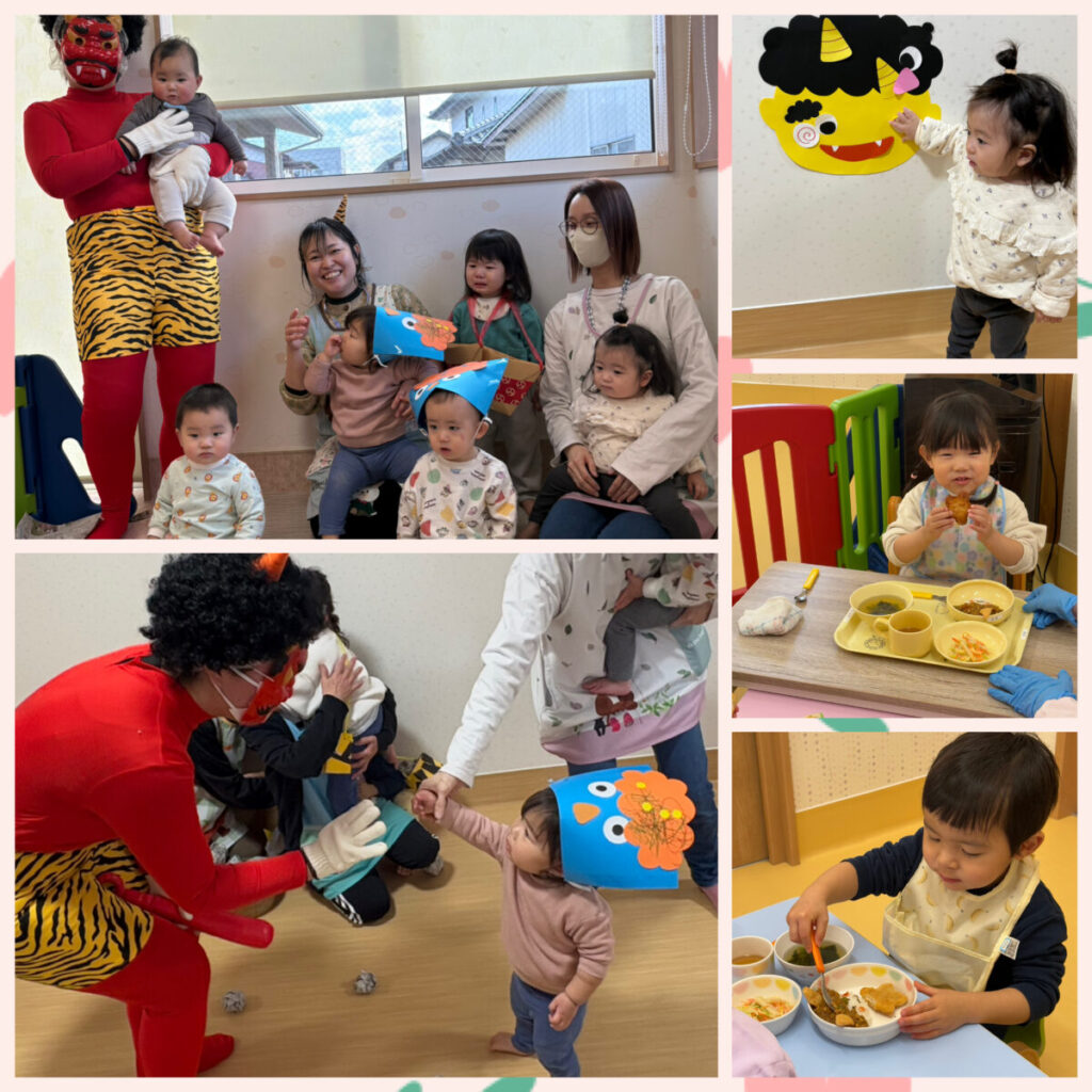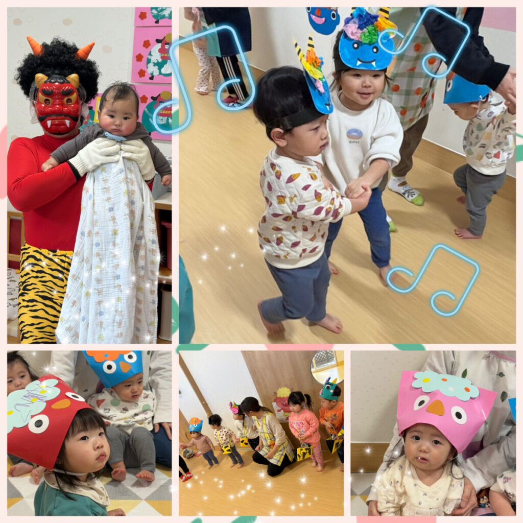 投稿日:2026年3月5日 ~豆まき会~ 2月3日(火)は豆まき会をしました👹 可愛い鬼のお面をつけて、「おにはーそとー!ふくはーうち!」と掛け声の練習😊 「鬼の福笑い」や「赤鬼と青鬼のタンゴ」のダンスを踊り元気いっぱい♪ 鬼が登場するとビックリ!!頑張って新聞紙の豆を投げる姿が格好良かったです💕 写真撮影後は、鬼さんカレーを食べてニッコリ笑顔😊楽しい時間を過ごしました!