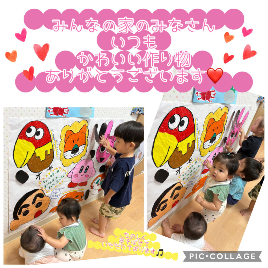 みんなの家のおじいちゃんおばあちゃんからは、素敵なクイズ付きの貼り絵🦁🐰をいただいて嬉しそうな女の子達😊🎁💚