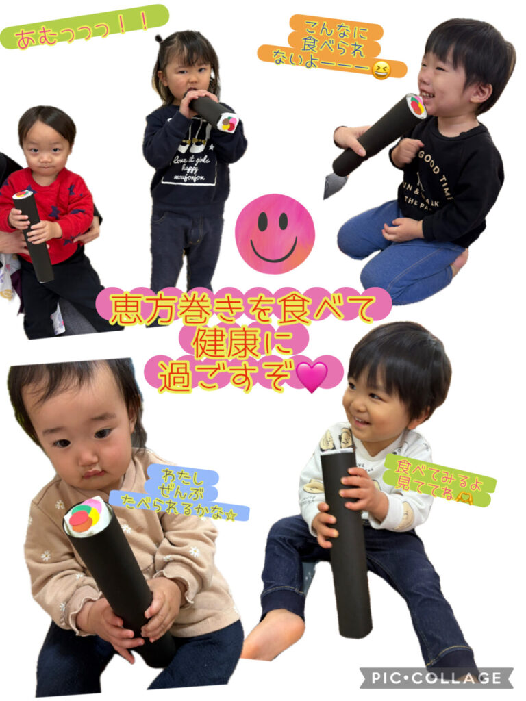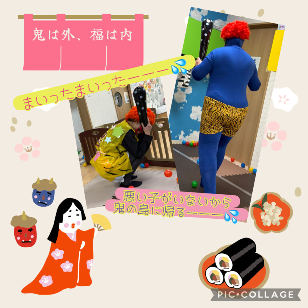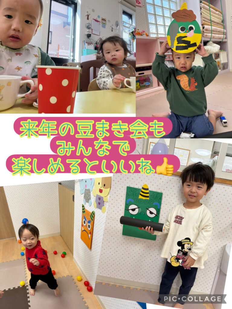 鬼パネルに向かって「鬼は外ーーー!」と上手にボールを投げ込むみんな✊「おに👹💗」「おに👹💗」とパネルを指差し👆ルンルンで豆まきごっこを楽しめました🎵朝から鬼が来るかも・・・と怯えていた子ども達も安心し切って遊んでいました🎵
